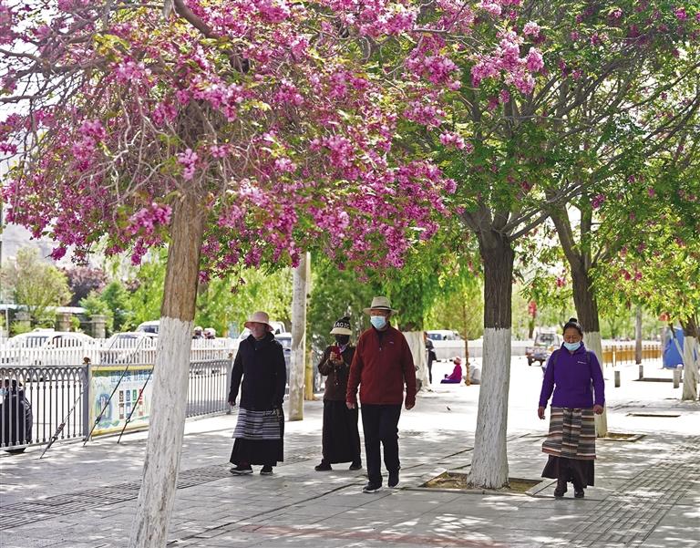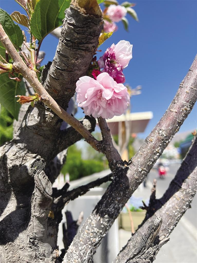 如今,走在市區(qū)街頭或公園,隨處可以看到開(kāi)花的樹(shù)種,有的已經(jīng)凋零,有的開(kāi)得正艷,有的含苞待放。在布達(dá)拉宮腳下的北京中路道路兩側(cè)櫻花全面盛開(kāi),粉紅色的櫻花宛如云霞,花瓣隨著微風(fēng)簌簌落下,煞是浪漫。將初夏的北京中路裝扮成一幅美麗的畫(huà)卷,吸引許多市民和游客賞花拍照。