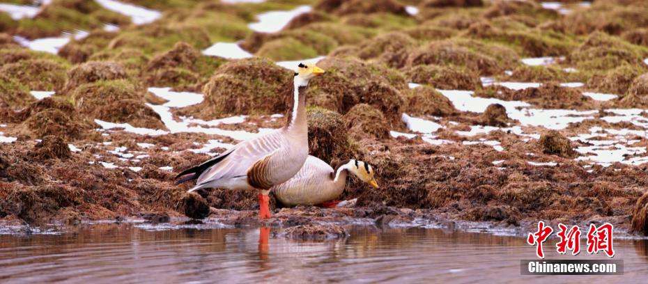 立夏以來,在位于祁連山國家公園內(nèi)的青海省海北藏族自治州祁連縣,當(dāng)?shù)孛癖娕臄z到多種野生動物活動影像。圖為斑頭雁在冰面行走。