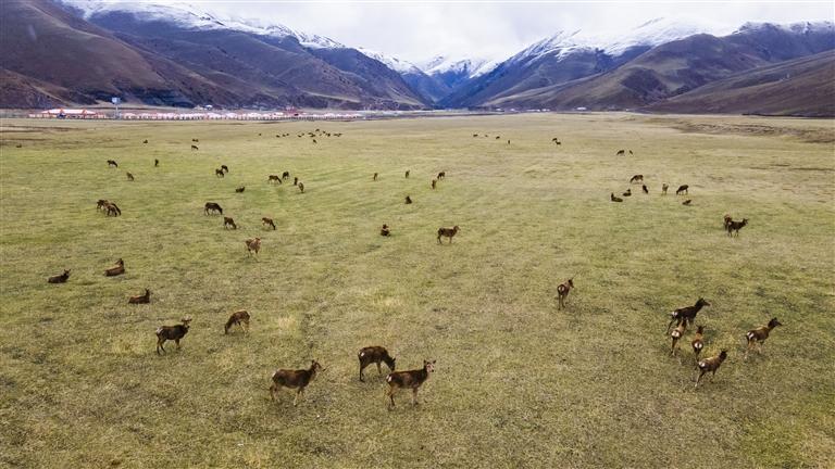 5月21日在類烏齊馬鹿國家級自然保護區(qū)拍攝的馬鹿(無人機照片)。新華社記者 周荻瀟 攝