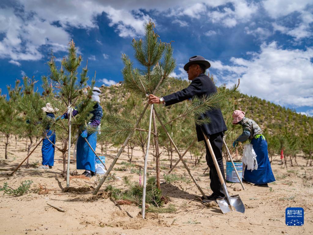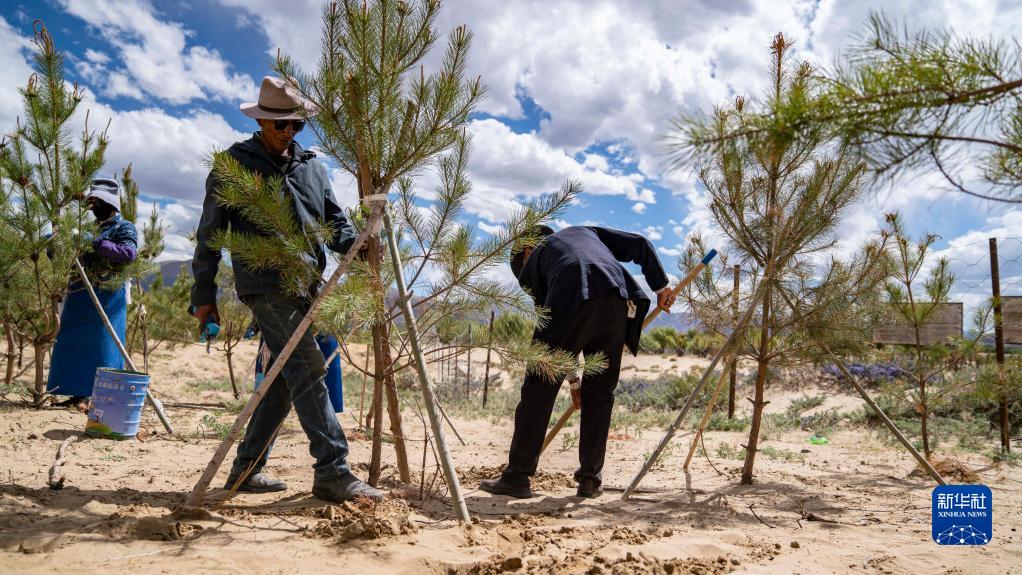 在西藏山南市扎囊縣,邊久(前)在雅江邊的造林地里指導工人種樹(5月26日攝)。新華社記者 孫非 攝