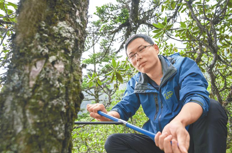 垂直距離只有300米,但密林中的行進并不容易。在向導帶領下,王文志和其學生抵達了林線處,腳踩松軟的苔蘚,他們展開作業(yè)。