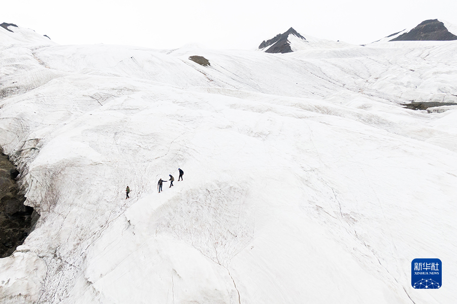 7月28日,來自長江科學(xué)院的科考隊(duì)員在長江源格拉丹東雪山上(無人機(jī)照片)。新華社記者肖藝九 攝