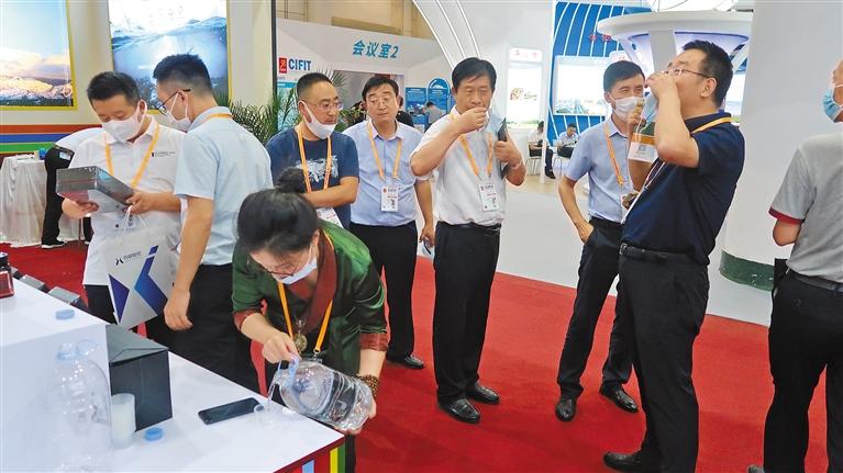 近年來,西藏加快發(fā)展飲用水產(chǎn)業(yè),積極拓展飲用水產(chǎn)品銷售渠道,在區(qū)內(nèi)外各種展覽會(huì)、展銷會(huì)、博覽會(huì)上大力推銷水產(chǎn)品。 圖為2020廈門國(guó)際投資貿(mào)易洽談會(huì)暨絲路投資大會(huì)上,與會(huì)者在展示展銷會(huì)現(xiàn)場(chǎng)品鑒西藏“地球第三極”產(chǎn)業(yè)發(fā)展有限公司生產(chǎn)的天然飲用水產(chǎn)品。(資料圖片)記者 王超 攝