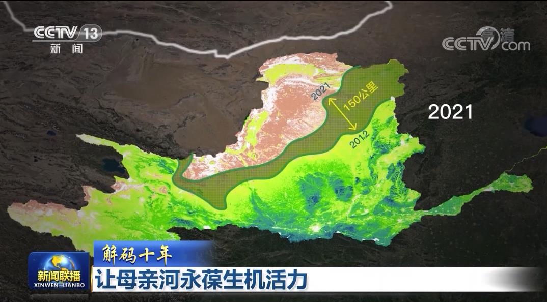 這是衛(wèi)星視角拍攝到的黃河,研究人員連續(xù)數(shù)年監(jiān)測,結(jié)合大數(shù)據(jù)還原了黃河沿岸的生態(tài)狀況??梢郧逦乜吹?,十年間綠進沙退,這條黃河生態(tài)綠線最寬處向前推進了約150公里。