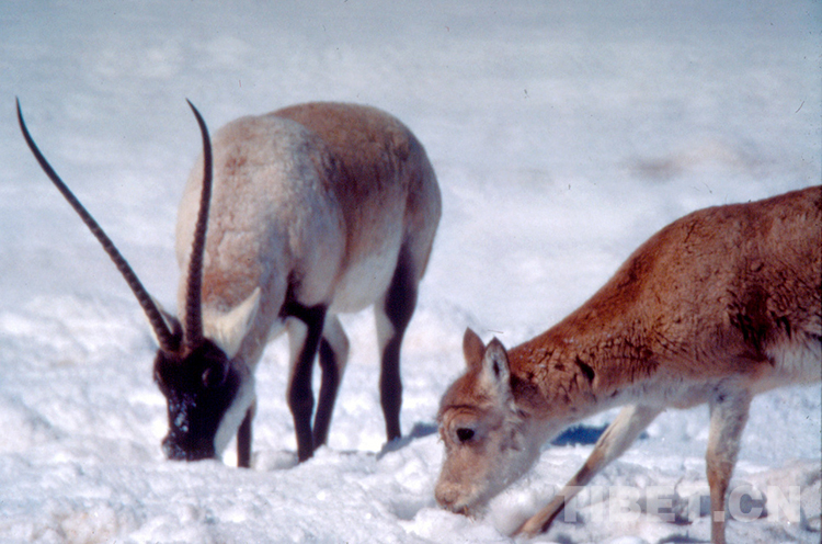 這是一對(duì)在羌塘國(guó)家級(jí)自然保護(hù)區(qū)雪地里覓食的國(guó)家一級(jí)保護(hù)動(dòng)物藏羚羊(唐召明提供,2007年6月21日攝)