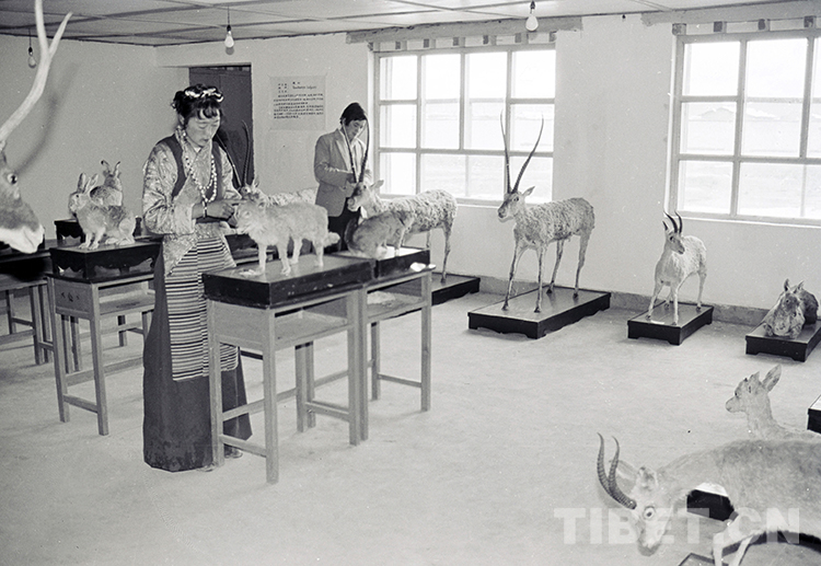 這是那曲地區(qū)(現(xiàn)那曲市)野生動(dòng)物標(biāo)本館的工作人員正在整理所展示的野生動(dòng)物標(biāo)本(唐召明1987年攝)