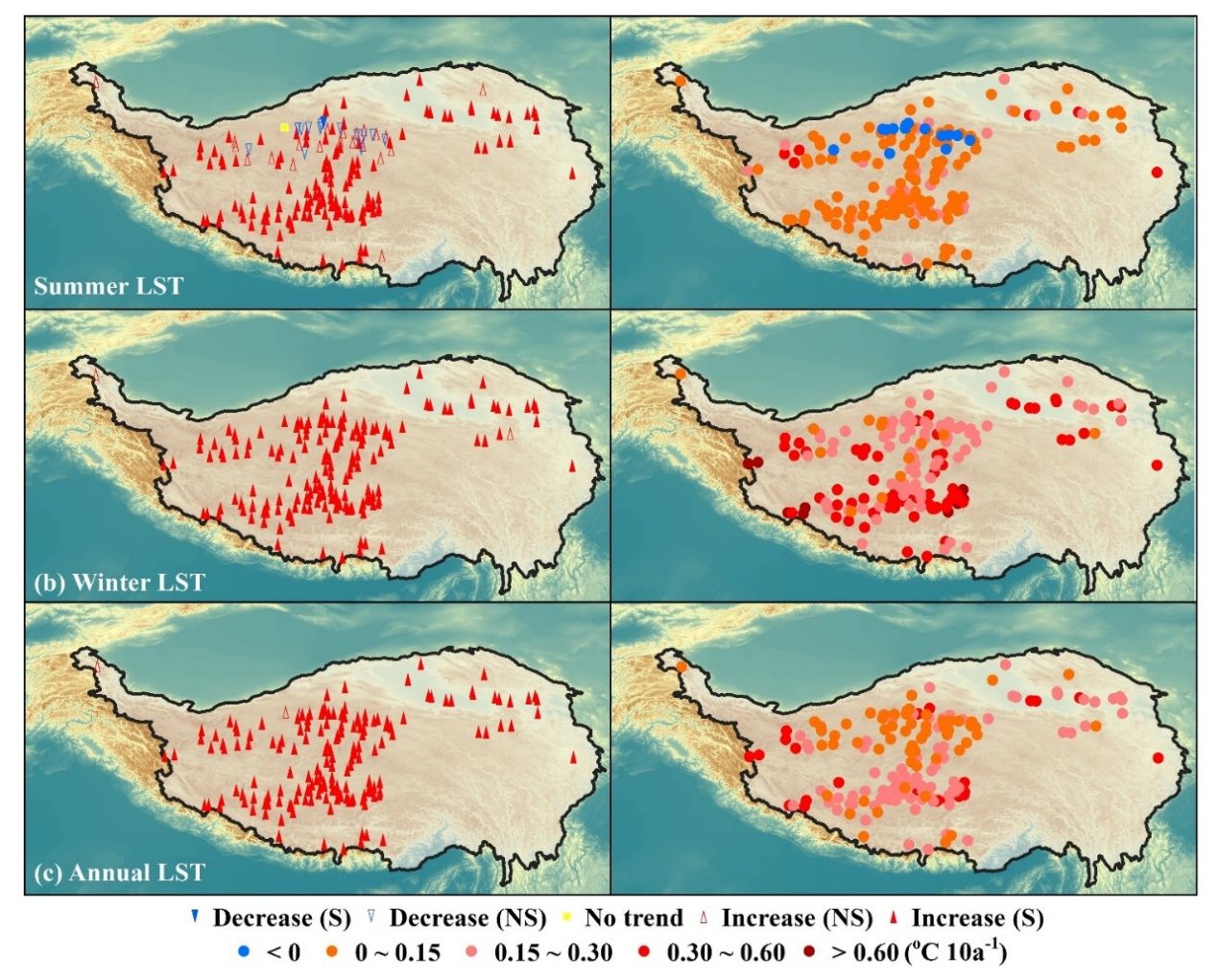 基于重建的湖面溫度時(shí)間序列,團(tuán)隊(duì)揭示了青藏高原湖面溫度的時(shí)空演化規(guī)律。研究發(fā)現(xiàn),近40年來(1978—2017年)青藏高原絕大多數(shù)湖泊的表面溫度均呈上升趨勢,升溫速率約每10年0.01~0.47℃,且冬季升溫比夏季更顯著,南部湖泊升溫速率高于北部湖泊。此項(xiàng)研究成果對于未來進(jìn)一步評估氣候變化對青藏高原湖泊水熱收支變化的影響具有重要價(jià)值。