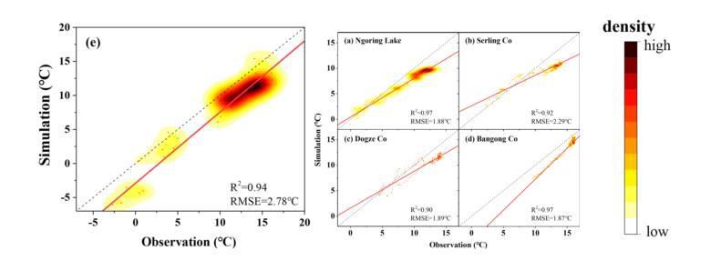湖泊水溫是區(qū)域水分與能量平衡的重要變量,也是湖泊水生生態(tài)系統(tǒng)的控制性參數(shù)。由于常規(guī)地面觀測的局限,青藏高原湖泊水溫觀測數(shù)據(jù)普遍缺乏。團(tuán)隊(duì)集成遙感與數(shù)值模擬技術(shù),發(fā)展了水溫?cái)?shù)據(jù)重建的技術(shù)框架,突破了模型數(shù)據(jù)要求高而移植性差的局限,實(shí)現(xiàn)了多相態(tài)(冰、水、冰水混合)下湖泊水溫的動態(tài)模擬,揭示了青藏高原湖泊水溫的時(shí)空演化規(guī)律及其對氣候變化的響應(yīng)。