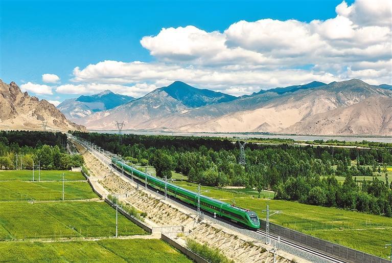 中央支持西藏自治區(qū)基本建成涵蓋公路、鐵路、航空、管道等多種運(yùn)輸方式的綜合立體交通網(wǎng)絡(luò)。2021年6月25日,川藏鐵路拉林段正式開(kāi)通運(yùn)營(yíng)。圖為開(kāi)通當(dāng)日,復(fù)興號(hào)高原內(nèi)電雙源動(dòng)車(chē)組首次開(kāi)上青藏高原。