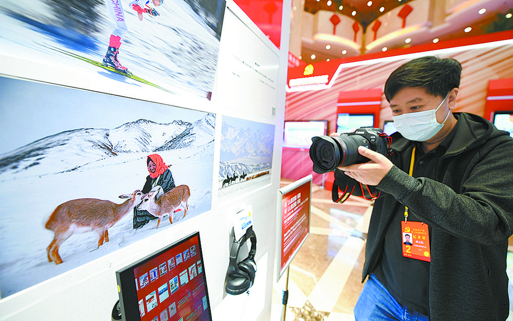 記者在新聞中心關注反映青海生態(tài)的照片。