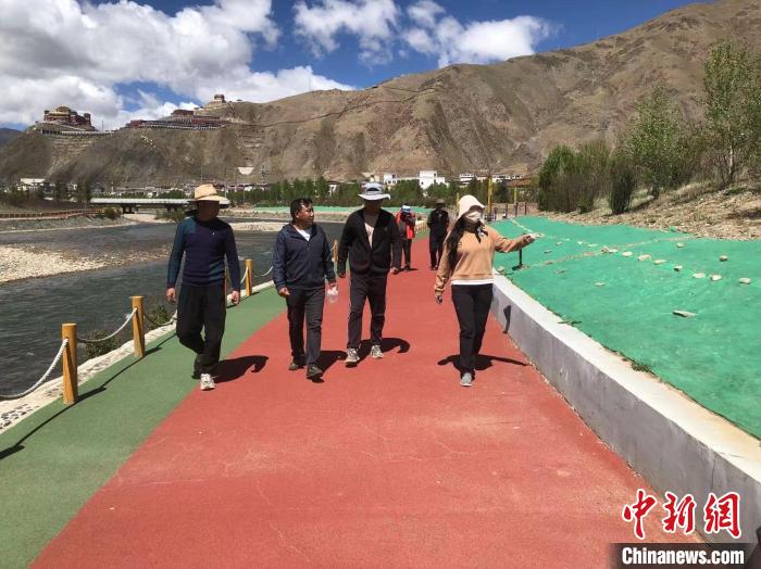圖為寧樣(右一)檢查玉樹市樹木生長(zhǎng)情況?!∮駱涫形麄鞑抗﹫D