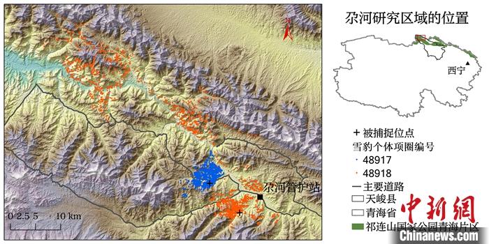 圖為“祁跡”“祁妙”活動范圍圖,藍(lán)色為“祁跡”,紅色為“祁妙”。 中新社發(fā) 祁連山國家公園青海省管理局 供圖