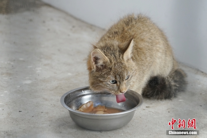 圖為1月18日,在青海省祁連山國家公園野生動物救護繁育站內(nèi),一只荒漠貓正在進食。 中新社記者 馬銘言 攝