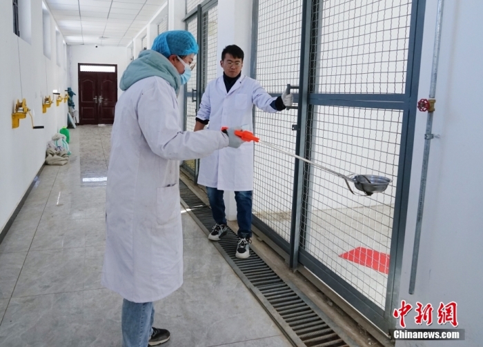 圖為1月18日,在青海省祁連山國家公園野生動物救護繁育站,李全亮和徐豐奕(左)準備給動物們投食。 中新社記者 馬銘言 攝