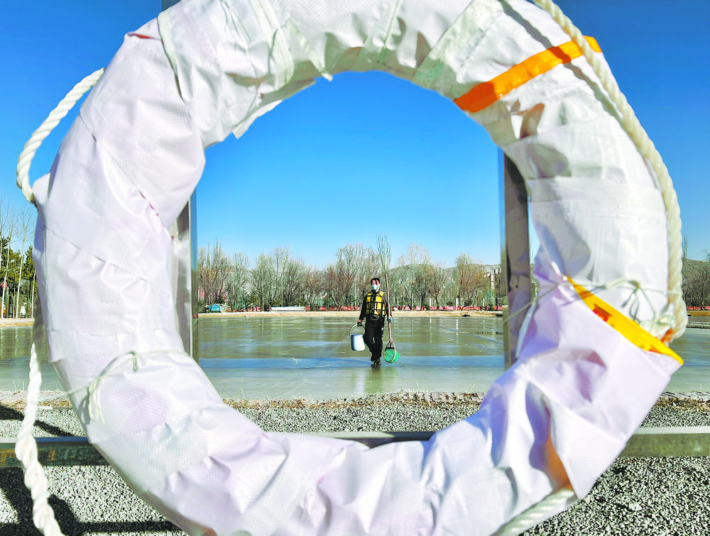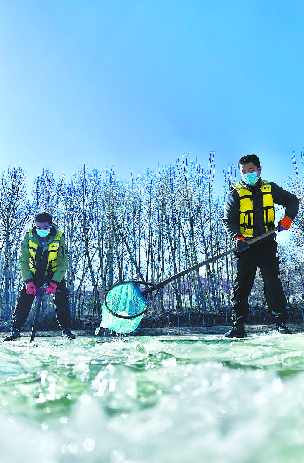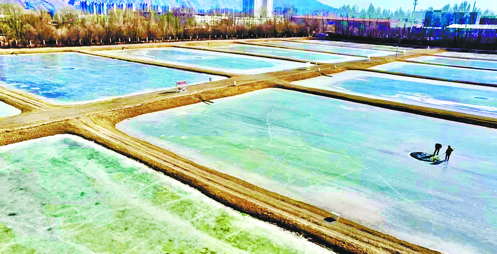 陽光透過冰面照射在18口冰封的魚塘里,為過冬的小魚苗增氧增溫。這片池塘是裸鯉來到裸鯉救護中心的第一站,田文根是這里的一名工作人員,主要負責(zé)室外原種場魚苗的培育和水質(zhì)監(jiān)測工作。據(jù)他介紹,魚塘的水質(zhì)決定著魚苗的健康狀況。在冬季,及時掃雪是一項非常重要的工作,因為冰層下面的裸鯉魚苗是靠浮游植物通過光合作用產(chǎn)生的氧氣生存,如果雪附著在冰層上,陽光無法透進,就容易造成缺氧。