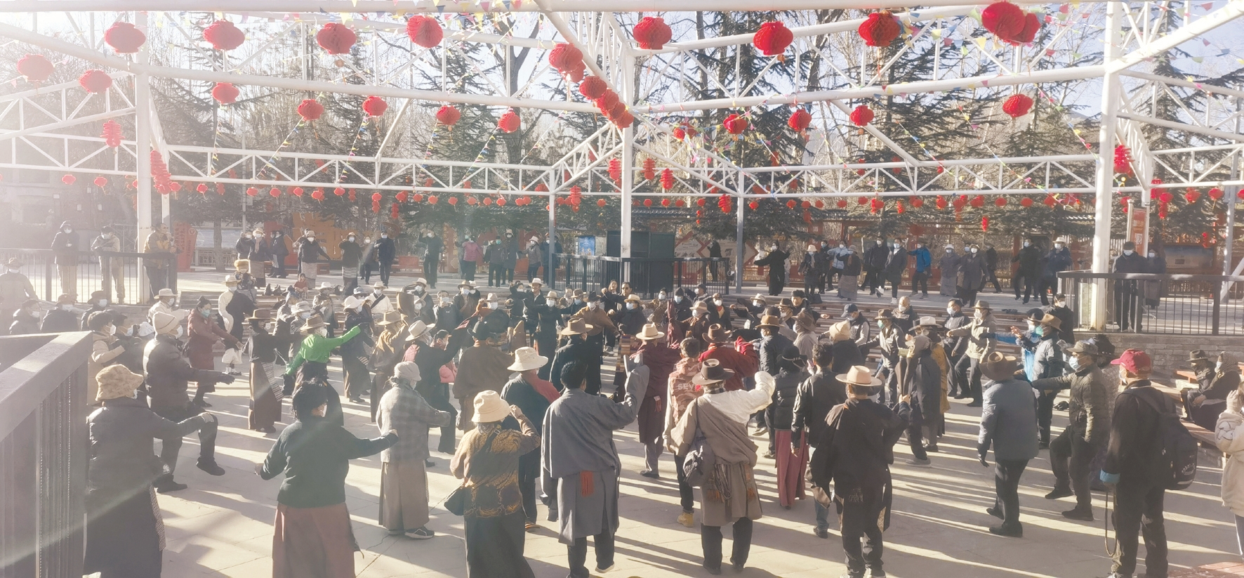 宗角祿康公園是市民群眾戶外活動(dòng)的重要場所,近年來,為豐富群眾精神文化生活,拉薩市大力倡導(dǎo)全民健身,不斷完善公園健身器材,這里已成為市民每天進(jìn)行晨練和休閑的首選之地。一大早,記者來到該公園看到,藏歷新年臨近,公園內(nèi)到處掛起了紅紅火火的燈籠,讓公園換上了“新裝”,在陽光的照射下,鮮艷奪目,喜氣洋洋,與公園風(fēng)景交相輝映,形成一道道靚麗的風(fēng)景線。市民們不約而同地來到這里開展健身操、鍋莊、現(xiàn)代舞等健身活動(dòng)。