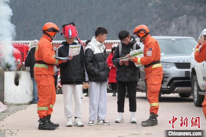 圖為森林消防員在景區(qū)重點(diǎn)區(qū)域普及防火知識?!×种ナ猩窒拦﹫D