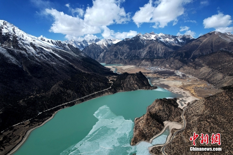 2月16日,西藏昌都,然烏湖半冰半水的湖面與雪山、藍(lán)天相互映襯,美如畫(huà)卷。(無(wú)人機(jī)照片)