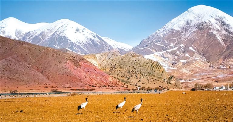 圖為在拉薩市林周縣,黑頸鶴在雪山腳下的農田里覓食(3月1日攝)。新華社記者 沈虹冰 攝