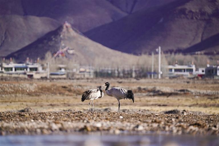 黑頸鶴是國家一級保護動物,在藏語中稱為“沖沖”。主要棲息在海拔2500米至5000米的高原、草甸、沼澤地帶。拉薩北部的林周縣平均海拔約4200米,是黑頸鶴的主要越冬地之一。最近這段時間,對拉薩市林周縣野保員們來說,一邊要忙自家的農(nóng)活,一邊還要巡查候鳥情況?!耙呀?jīng)有一小部分飛走了,估計再過半個月都會陸續(xù)飛走。”3月23日上午,野保員旦增告訴記者,在虎頭山水庫和卡孜水庫越冬的候鳥有一部分已經(jīng)飛走了。野保員口中的“飛走”便是遷徙,遷徙是候鳥的本能,一年一年,跟隨時間的召喚,完成兩次遷徙:繁殖和越冬。
