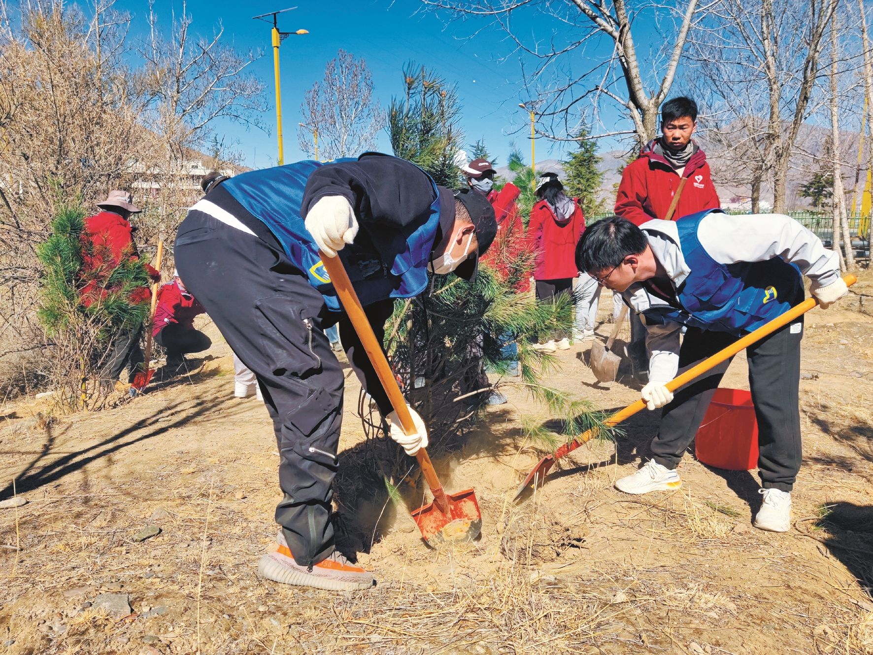 現(xiàn)場,志愿者手拿垃圾桶、夾子等工具,認真清理地面上的垃圾。隨后,不同團體志愿者被劃分為7個組開始植樹,大家干勁十足、配合默契,一起立苗、填土、澆水,有條不紊完成每道工序,并給每棵樹系上絲帶。經(jīng)過一番熱火朝天的勞動,一棵棵新栽下的樹苗昂然挺立,為初春的山坡增添了一片新綠?;顒娱g隙,大家相互交流,憧憬著多年后荒灘變青山的場景。