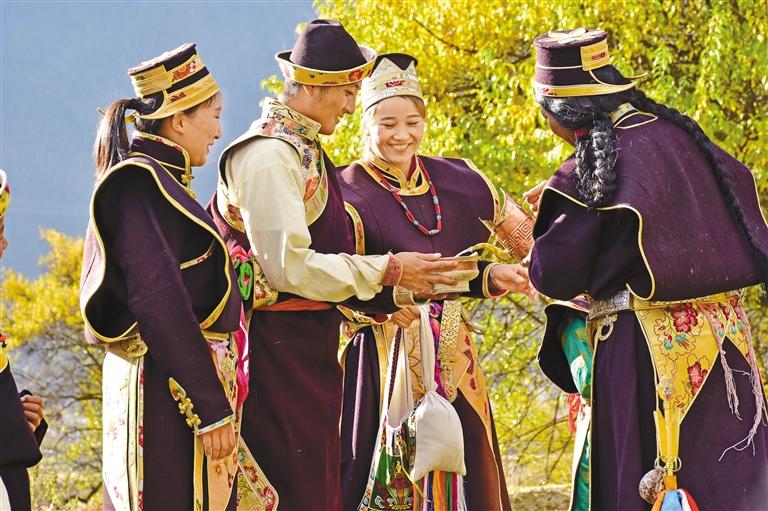巴宜區(qū)布久鄉(xiāng)擁有濃厚的工布民俗文化氛圍,當(dāng)?shù)爻浞职l(fā)揮“旅游+民俗文化”的優(yōu)勢(shì),吸引游客前來體驗(yàn)。圖為布久鄉(xiāng)朵當(dāng)村身著傳統(tǒng)工布藏裝的村民。