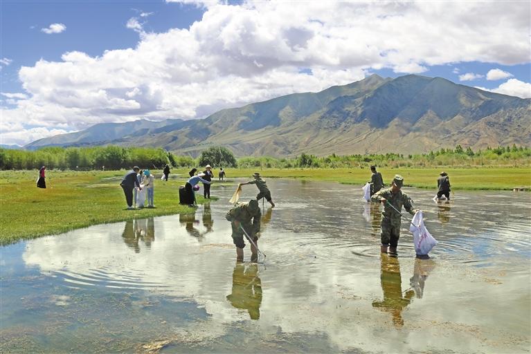綠水青山就是金山銀山。為全面貫徹黨的二十大精神,充分尊重自然、順應(yīng)自然、保護(hù)自然,提高廣大黨員骨干的綠色環(huán)保意識,近日,日喀則市桑珠孜區(qū)人民武裝部聯(lián)合桑珠孜區(qū)退役軍人事務(wù)局,組織官兵與江當(dāng)鄉(xiāng)、年木鄉(xiāng)退役軍人、民兵黨員在雅江中游河谷黑頸鶴保護(hù)區(qū)開展“呵護(hù)綠水青山”主題黨日活動?;顒又校V樽螀^(qū)人民武裝部組織重溫入黨誓詞,隨后,30多名黨員開展拉網(wǎng)式清理水域漂浮物和白色垃圾,給“高原精靈”營造一個美麗舒適的“家”。