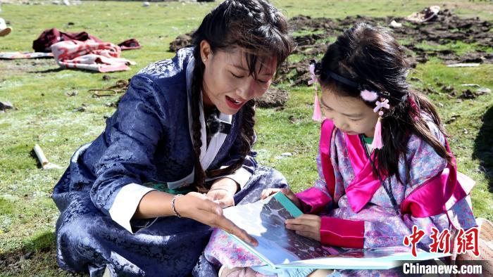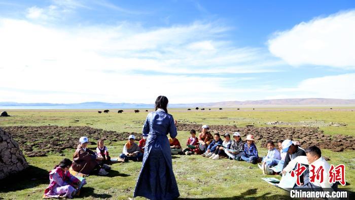 圖為青少年在納木錯湖畔的牧區(qū)共同閱讀《牛糞們的愿望》。拉薩市圖書館供圖