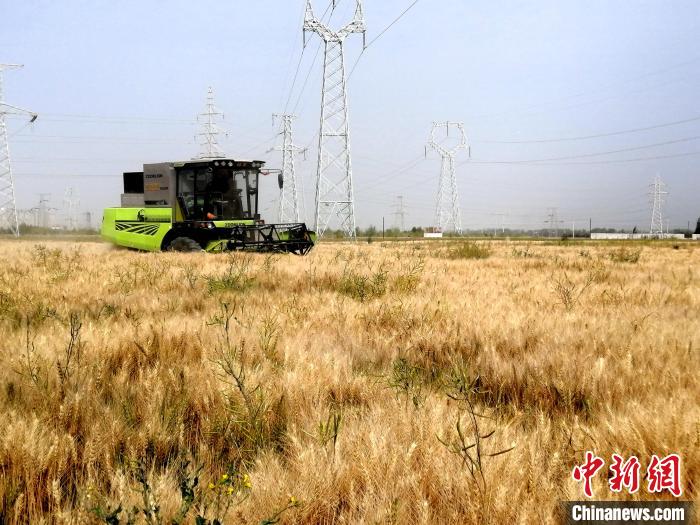 連日來,中國“鹽湖城”青海省格爾木市小麥進(jìn)入收割期。田野里,機(jī)聲隆隆,一臺臺聯(lián)合收割機(jī)穿梭麥田中,“吞”穗“吐”麥,一派豐收景象。