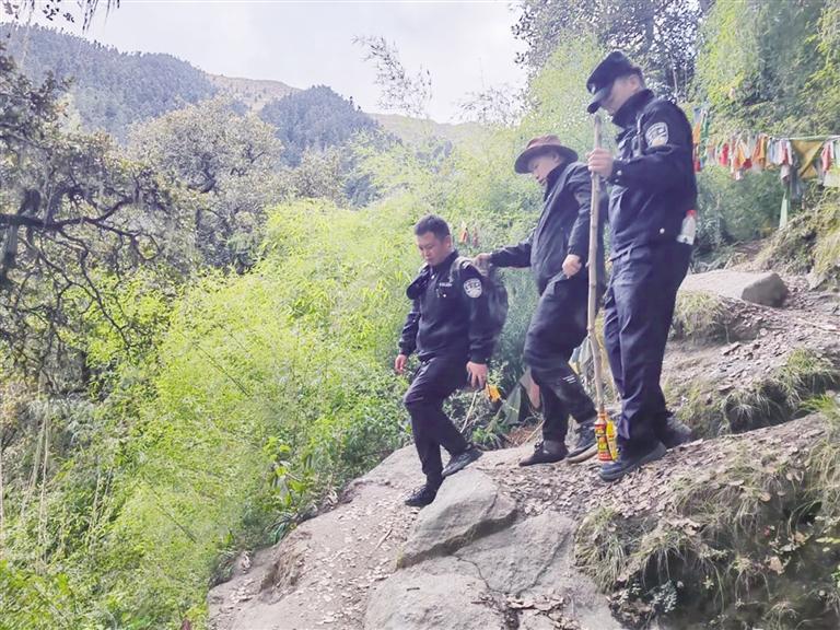 “事發(fā)地點在苯日山景區(qū)核心區(qū),山坡陡峭,荊棘密布,山高風大,又有降雨,搜救工作具有一定難度??紤]到苯日山景區(qū)海拔較高,唐先生已在山上逗留時間較長,可能出現(xiàn)體能耗盡、通訊設(shè)備電量不足等問題,我們必須加快搜救進程?!泵兹疣l(xiāng)派出所民警四郎羅布回憶道。該所民輔警平日經(jīng)常開展巡山工作,對山路非常熟悉,最終在三小時內(nèi)成功鎖定唐先生的位置。
