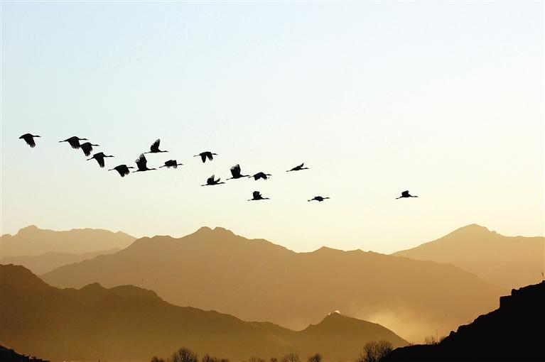 群山中飛翔的黑頸鶴(拍攝地:拉薩市林周縣)格桑加措 攝