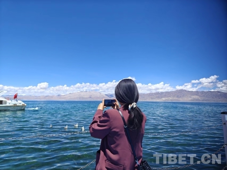 圖為游客在班公錯拍景色 攝影:次旦拉姆
