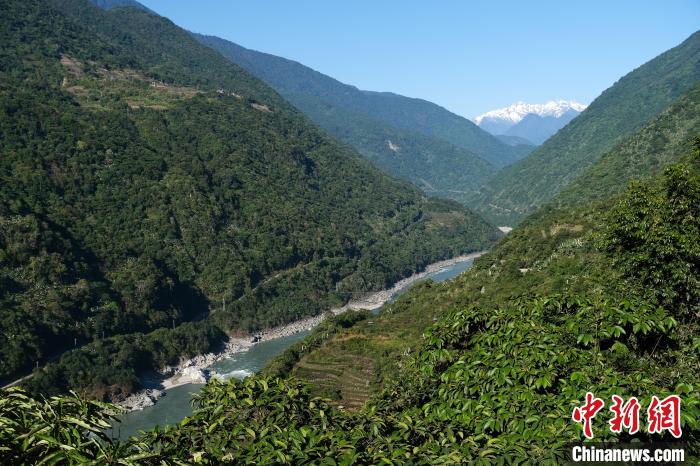 12月19日,西藏墨脫縣雅魯藏布江沿岸植被以及遠處的雪山。中新社記者 江飛波 攝