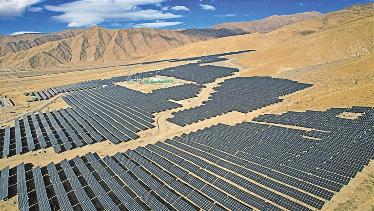 圖為瓊結(jié)縣白那村50兆瓦光伏儲(chǔ)能項(xiàng)目(無(wú)人機(jī)拍攝)。記者 旦增蘭澤 通訊員 倫珠澤仁 攝