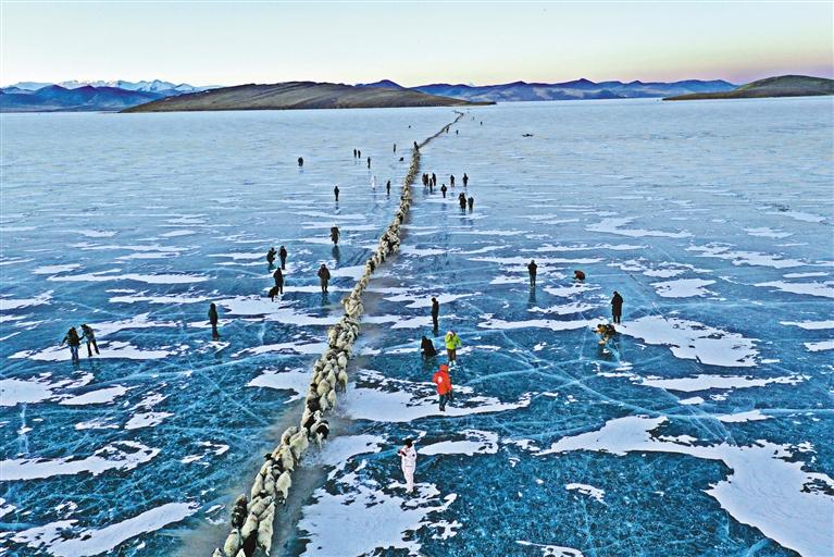 圖為推瓦村冰上牧羊轉(zhuǎn)場現(xiàn)場。記者 潘多 劉楓 攝