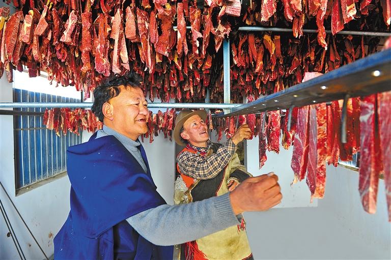 上左左農(nóng)牧民合作社經(jīng)理桑嘎石確(左)和村委會(huì)主任羅布占堆在查看晾制的風(fēng)干牦牛肉。記者 溫凱 攝