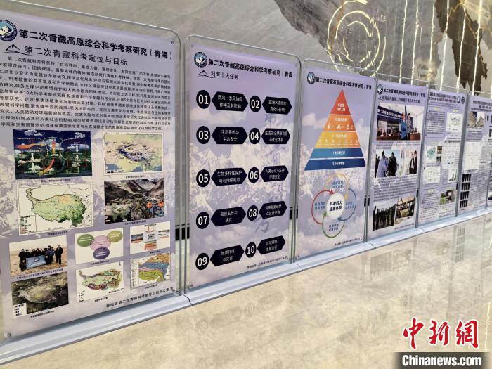 圖為第二次青藏科考成果助推青海交通高質(zhì)量發(fā)展對接會場外展板,展示科考項(xiàng)目。 祁增蓓攝
