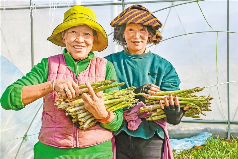 圖為大棚內,員工展示新鮮的有機蘆筍。記者 劉楓 攝