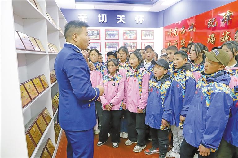 圖為消防員為師生們講解隊伍榮譽(yù)。記者 貢秋曲措 攝