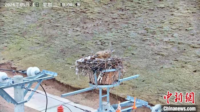 圖為監(jiān)控畫面顯示:5月21日,在青海玉樹藏族自治州嘉塘草原,10千伏珍一路的67桿塔上,一只大鵟正在孵化幼鳥。國(guó)網(wǎng)青海省電力公司供圖