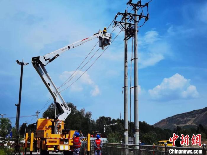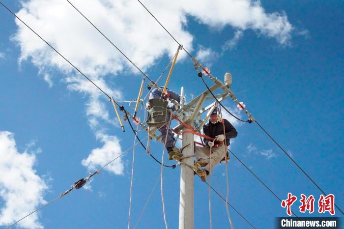 圖為電力人員正在架設(shè)鳥巢。國(guó)網(wǎng)青海省電力公司供圖