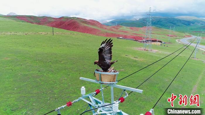 圖為大鵟準(zhǔn)備飛離生命鳥巢捕食。國(guó)網(wǎng)青海省電力公司供圖