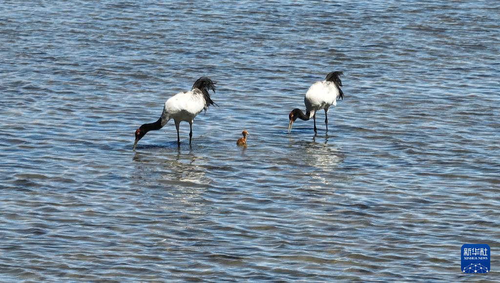 6月9日,一對黑頸鶴夫婦帶著雛鳥在西藏那曲市申扎縣一處濕地棲息、覓食。新華社記者 晉美多吉 攝