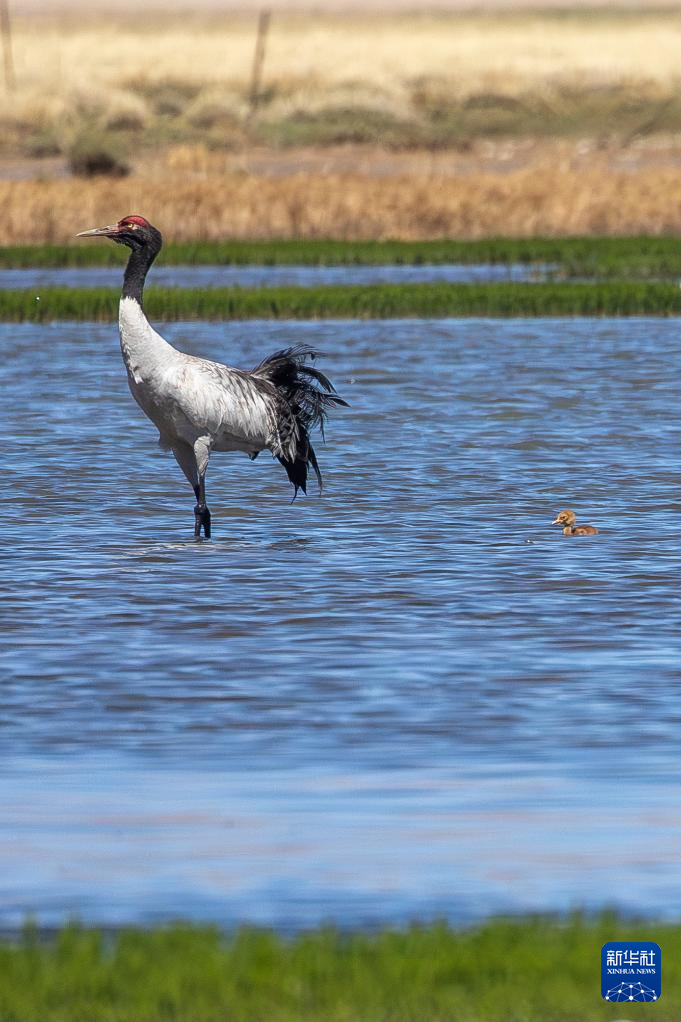 6月9日,黑頸鶴帶著雛鳥在西藏那曲市申扎縣一處濕地棲息、覓食。新華社記者 晉美多吉 攝