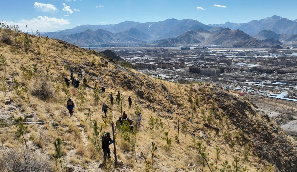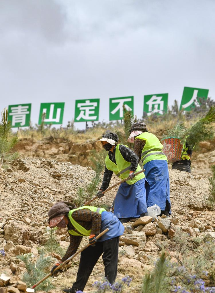 在拉薩南北山綠化2024年度一期工程貢嘎縣造林項(xiàng)目貢嘎2號(hào)片區(qū),當(dāng)?shù)卮迕裨谠詷湓炝郑?月3日攝)。新華社記者 晉美多吉 攝
