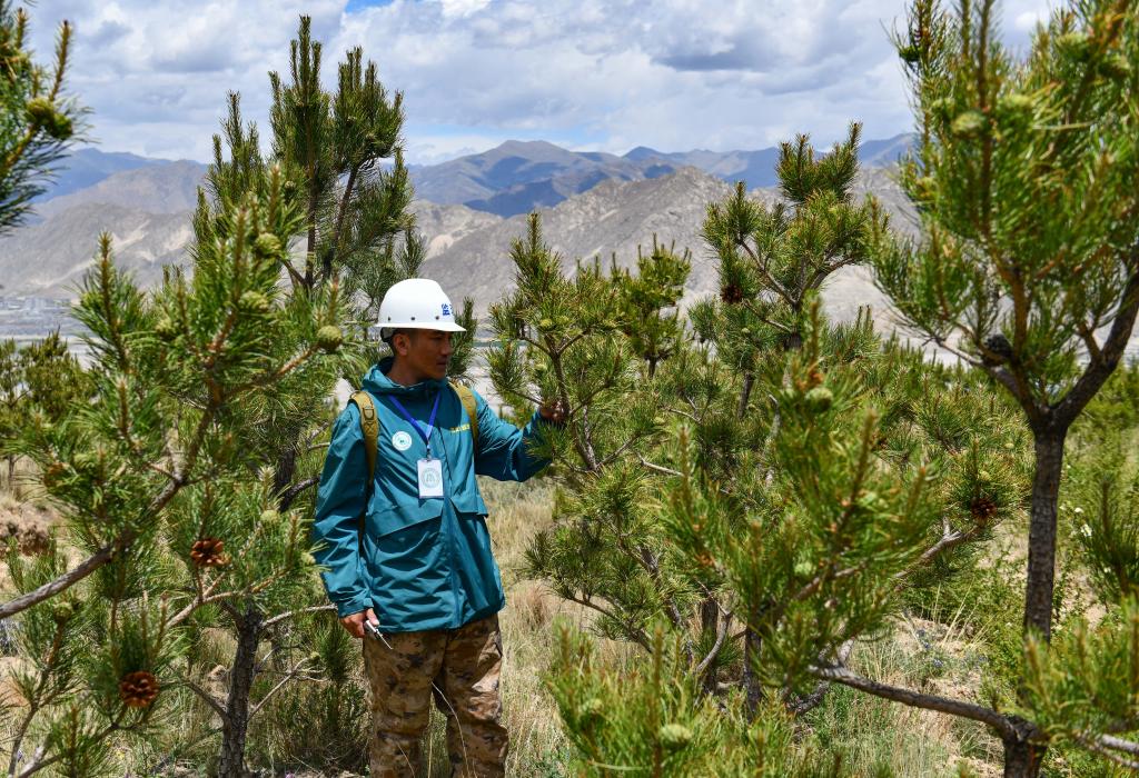 拉薩南北山綠化工程2024年度鞏固提升(貢嘎機(jī)場(chǎng)周邊山體)工程項(xiàng)目上,第三方監(jiān)理人員在檢查樹木狀況(6月3日攝)。新華社記者 晉美多吉 攝