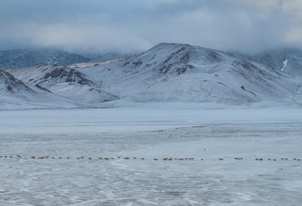 在甜水河畔荒灘雪地中向產(chǎn)羔地遷徙的藏羚羊(6月14日攝)。