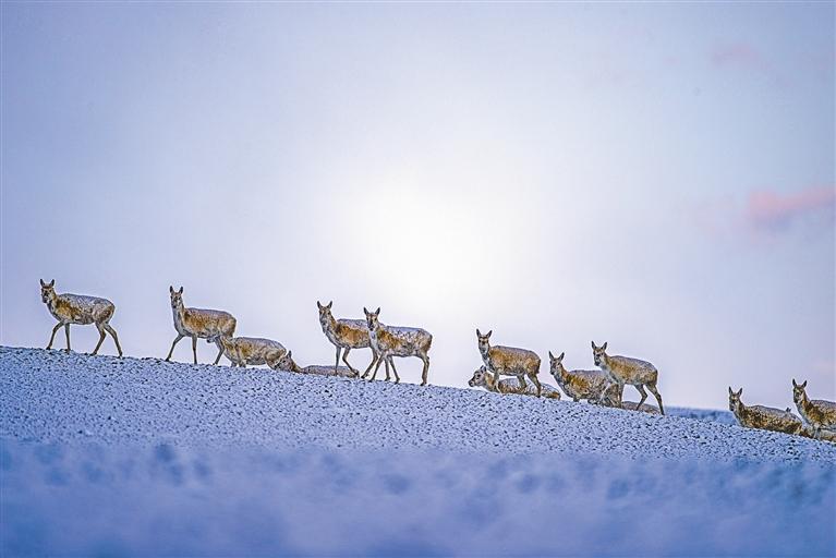 6月15日清晨在羌塘國家級自然保護區(qū)拍攝的遷徙中的母藏羚羊。新華社記者 費茂華 攝