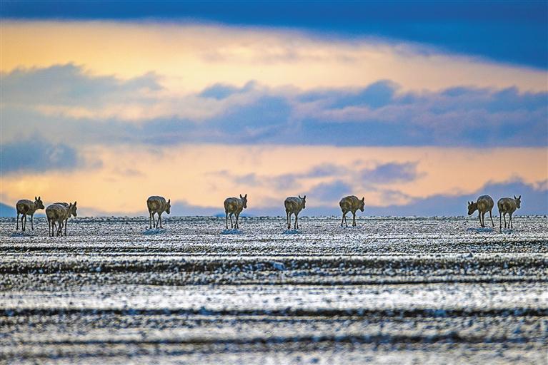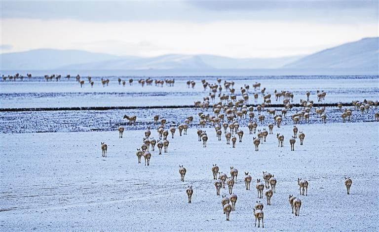 藏羚羊在甜水河畔雪地荒灘上向產羔地遷徙(6月15日攝)。 新華社記者 姜帆 攝