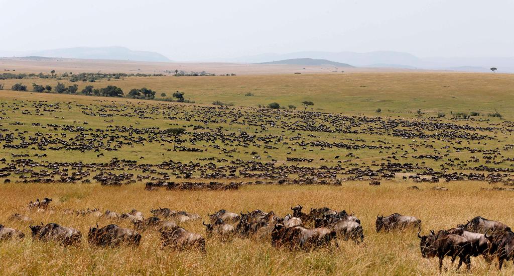 在馬賽馬拉國家保護區(qū),遷徙中的野生動物在草原上覓食。
